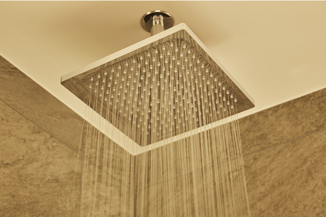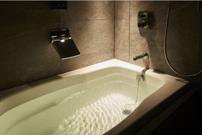 浴室にも、サウナーの皆様に喜んでいただける細かいこだわりを施しました。ユニットバスにはチラーを仕込み、サウナ上がりにキンキンの水風呂として活用いただけます。オーバーヘッドシャワーが浴槽の上に設置され、水風呂に入りながら冷たい15度の滝を浴びることができます。好きな音楽を流せるスピーカーや水面に波紋が浮かぶライトなどを組み合わせながら、自分好みのサウナタイムを演出可能です。