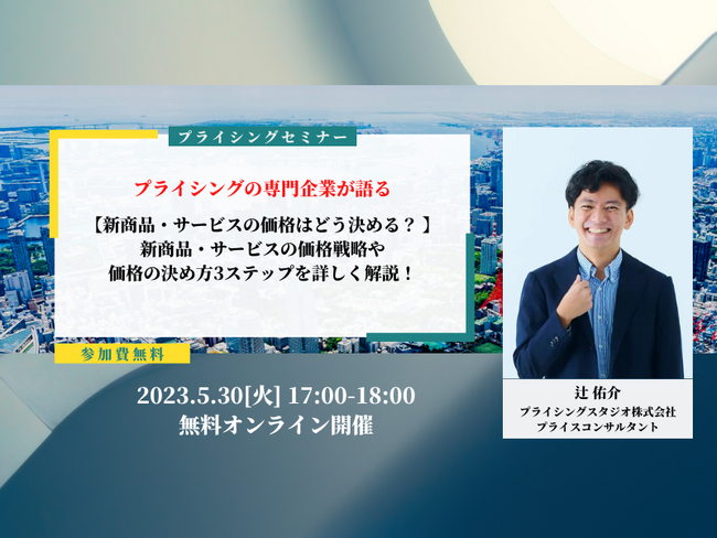 プライシングスタジオ株式会社(本社:東京都港区、代表取締役:高橋 嘉尋)は、無料オンラインセミナー『新商品・サービスの価格はどう決める? 新商品・サービスの価格戦略や価格の決め方3ステップを詳しく解説!』と題してセミナーを5月30日(火)17時に開催いたします。