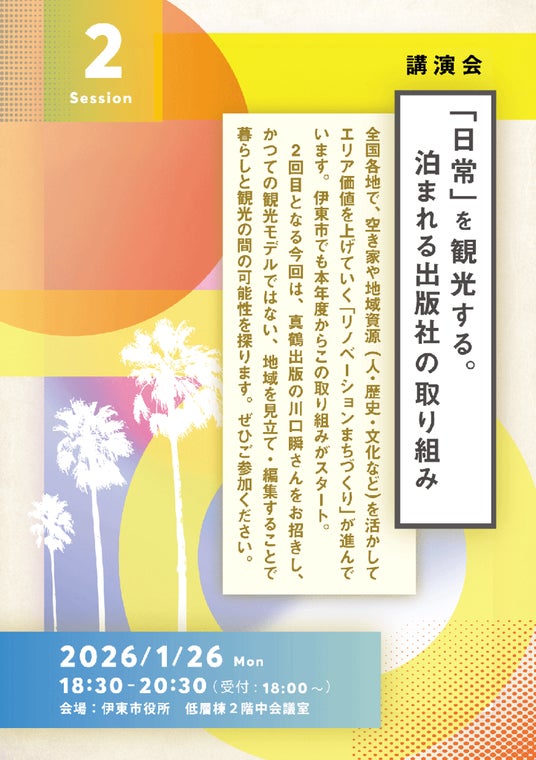 全国各地で、空き店舗・空き家や地域資源(人・歴史・文化)を活かして、エリア価値を上げていく「リノベーションまちづくり」が進んでいます。伊東市でも本年度からこの取組がスタート。今回の講演会は、その具体的な実践事例を学ぶ講演会です。これからの時代は、どうまちを見立て、どんなアクションをすることが必要なのか。2015年から神奈川県真鶴町に移住し、「泊まれる出版社」をコンセプトに真鶴出版を立ち上げ出版を担当している川口瞬さんをお招きし、観光×リノベーションのお話をしていただきます。是非、ご参加ください。