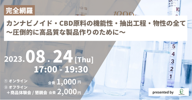 CBD原料の卸売・OEM(製造受託)事業を行うOFF株式会社(本社:東京都目黒区、代表取締役:駒形・井上)は、オフライン・オンライン同時セミナー『カンナビノイド・CBD原料の機能性、抽出工程、物性の全て ~圧倒的に高品質な製品作りのために~』を2023年08月24日(木)に開催いたします。