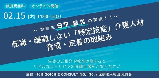 ICHIGOICHIE CONSULTING,INC(本社:フィリピン、代表取締役:三浦 一生)と医療法人社団光誠会(東京都立川市)は、2024年2月15日(木)「特定技能」介護人材の育成・定着をテーマに、介護事業者の皆様向けオンラインセミナーを開催いたします。