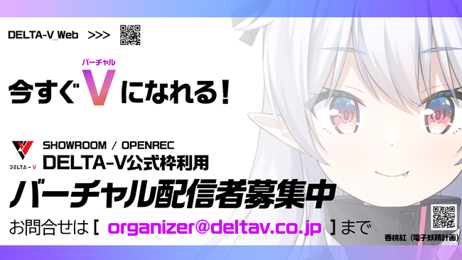 株式会社DELTA-VではSHOWROOM / OPENREC…等のLIVE配信プラットフォームにてDELTA-V公式枠をご利用されるバーチャル配信者を募集しております。「個人Vの公式枠利用」という形で個人活動という立場を維持しながら利用できますのでお気軽にお問い合わせください。