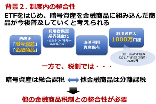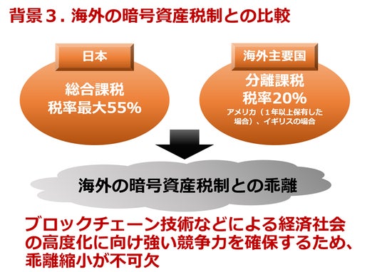 また、暗号資産の利用実態により適合した税制を整備している海外の暗号資産税制と比較した場合、劣後していると言わざるを得ない現行税制は、我が国が築いてきた暗号資産における規制環境の優位性を活かせない事態も生じさせています。