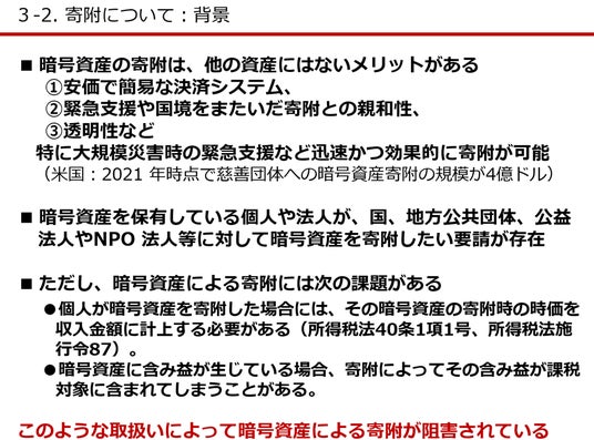 暗号資産を取り巻く様々な環境の変化に対応し、現行の税制度が有する課題を解決するために、暗号資産税制の改正は不可欠であると考えます。暗号資産取引にかかる所得区分の見直しを行うとともに、申告分離課税及び損失繰越制度を導入することによって、利用者による適正かつ積極的な申告を促進し、健全かつ公正な納税環境の整備を実現し、法制度内での整合性・公平性を高め、我が国の海外に対する所得税制上における劣後の状況を一定程度克服することができるものと考えます。また、暗号資産の寄附にかかる税制の整備、及び暗号資産の相続人に対する過大な税負担を解決するための資産税の整備も同様に欠かせないものと考えます。