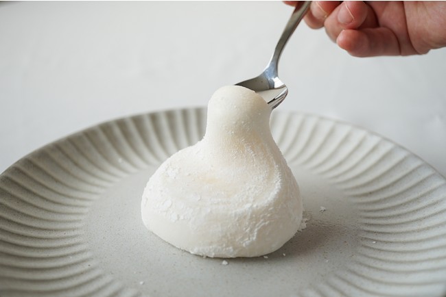 くちどけにこだわり、これまでの大福にはない『スプーンで食べる』とろけるくりーむ大福。富山県産のブランド米、新大正もち米を使用したもちことメレンゲを合わせて、なめらかでとろける求肥が実現しました。