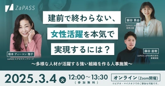 2025年3月8日の国際女性デーを前に、ZaPASS JAPAN 株式会社(本社:東京都千代田区、 代表取締役社長:足立愛樹)は、企業の人事担当者・経営層向けに「女性管理職の活躍」をテーマとした特別オンラインセミナーを3月4日(火)12:00~13:30に開催いたします。