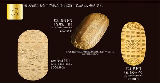 今回、特別展示するのは、今年の干支の辰にちなんだ高さ約2.1mの「黄金の龍」。金箔を約3,000枚使用して金工作家が製作した大迫力の金工芸品で、参考価格は3,850万円です。また、同じく縁起物である龍の「K24 大龍」と「K24 龍神小判」の二つを【特別企画品 開運セット】として販売いたします。