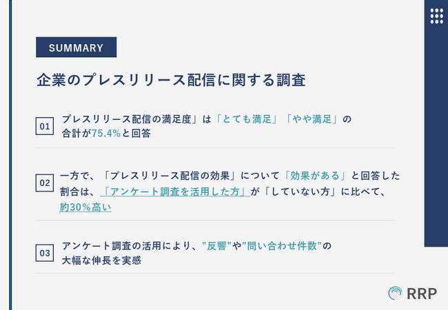 「RRP」とは、Research Release PRの略語で、ファクトデータを基にプレスリリースを打つ施策です。1,022万人もの多種多様なモニターによるリアルなアンケート結果に裏付けられたリリースが、あらゆる業界のお客様における商品・サービスの認知度向上と企業ブランディングに貢献します。