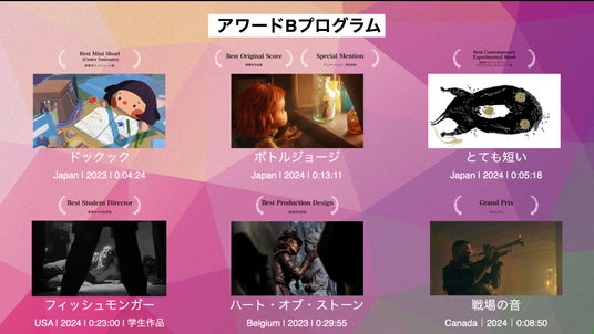 受賞作品だけをプログラムする第19回札幌国際短編映画祭のアワードプログラムA・B、劇場での上映作品は以下の通りです。