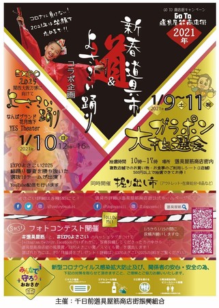 次に、1月10日には「よさこい大阪EXPO2025」を開催。千日前道具屋筋商店街のメンバーを中心に「道具屋筋まいど連」を結成しており、「よさこい踊り」で街を活気づかせようと励んでいます。今秋のよさこい大阪大会は中止になりましたが、「なんとかして発表の場を持たせてあげたい。練習の成果を出せる場を提供したい」と、千日前道具屋筋商店街振興組合事務局長の田部誠さん。今回、事前に映像審査を行い、勝ち抜いた選抜10チームが当日演舞を行います。YouTubeでライブ配信も実施予定。もちろんステージも感染対策を万全にし、検温、消毒、マスク必須で盛り上げます。