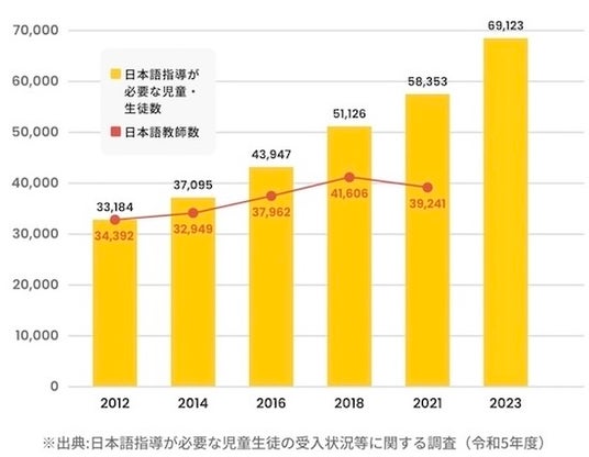 近年、日本の学校教育現場では、外国につながる子など、日本語指導が必要な子どもたちの数が増加傾向にあります。文部科学省が行った令和5年度の調査では、6.9万人となっており、過去10年間で最多となりました。