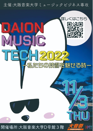 2022年11月3日(木)、大阪音楽大学(所在地:大阪府豊中市、学長:本山秀毅)音楽学部ミュージックビジネス専攻(以下MB専攻)はミュージックビジネス専攻のテーマである「音楽×テクノロジー×ビジネス」をテーマに「DAION MUSIC TECH 2022」を開催いたします。本イベントは、MB専攻の学生が企画・運営し、企業との連携を通じて来場者に“未来の音楽体験”を提供します。