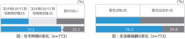 72%の方が「在宅時間が増えた」と回答、「生活の価値観に変化があった」と回答した割合は75%