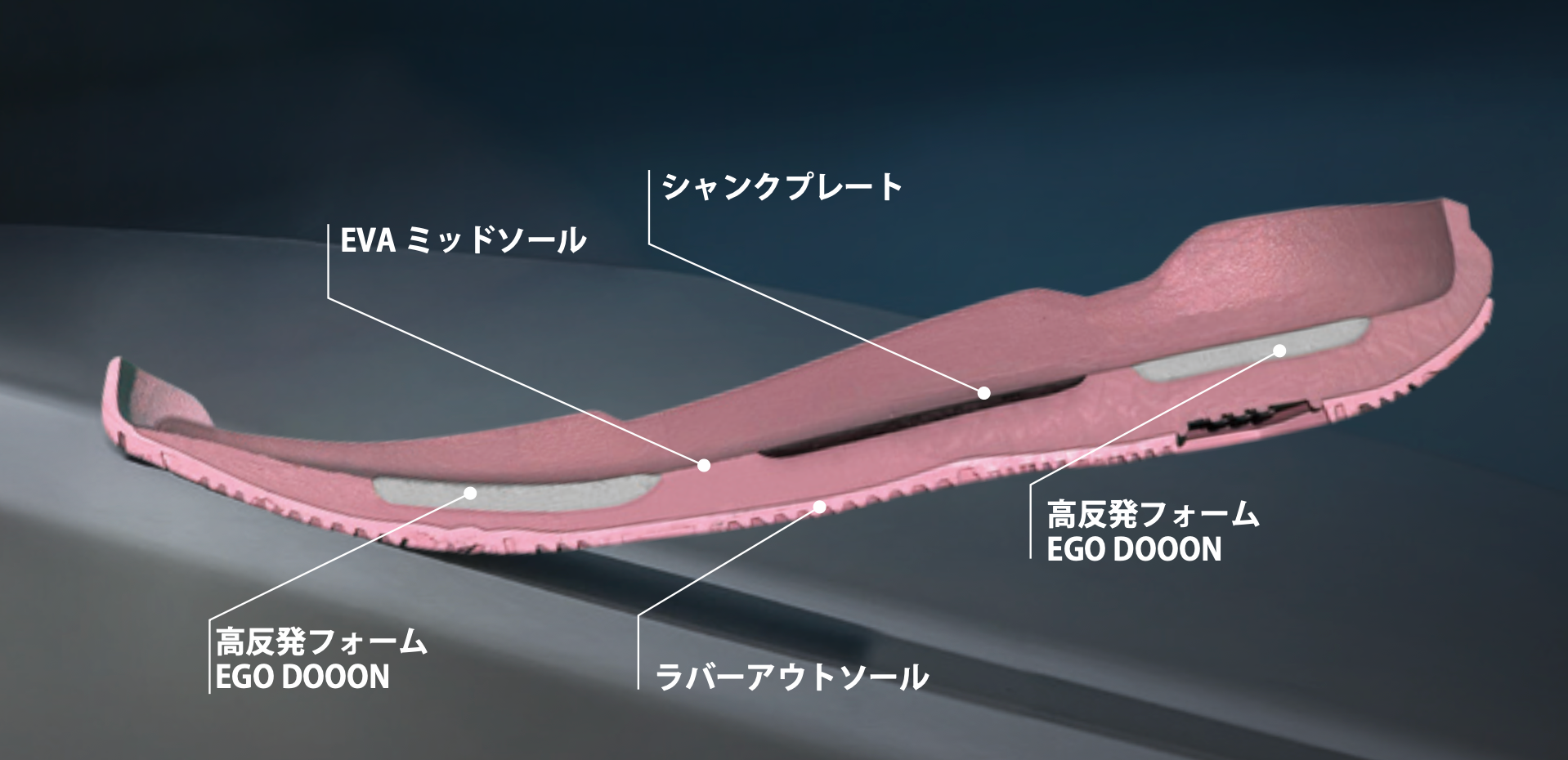 前足部は「コートを掴む感覚」を最大限に活かすために足裏と地面の距離を近く設定し、より瞬発的な動作を可能に。ミッドソール全体はEVA(合成樹脂)を採用、前後2箇所にEVAとは硬度の異なるEGOZARUの独自開発高反発フォームEGO DOOON(エゴドーン)を配し、前足部は接地感を損なわない適度な反発性を、踵部は安心感のあるクッション性を体感できる設計。さらに、中間層にねじれを抑制するシャンクプレートを内蔵することで安定感のある履き心地を実現。