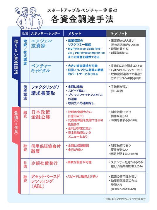 資金調達は、大きくデットファイナンスとエクイティーファイナンスの2つに分類できます。デットファイナンスは融資や社債調達を指します。エクイティーファイナンスは、株式発行による資金調達(もしくは株式譲渡)の手法が用いられ、スポンサーはエンジェル投資家/ベンチャーキャピタル等が選択肢となります。エクイティーファイナンス、融資、社債、ABL、ファクタリングを“借りない資金調達”と“負債”という2つに大きく分類し、メリット/デメリットを分析しました。