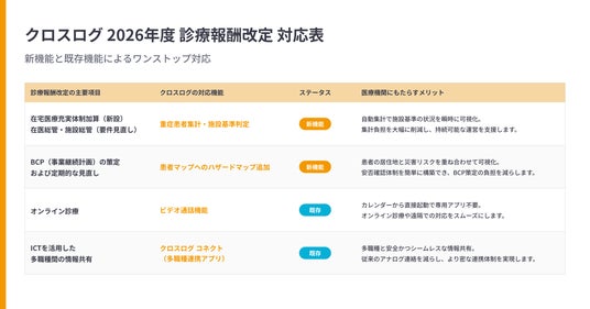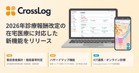 クロスログ株式会社(福岡市博多区、代表取締役CEO:宮原智新)は、在宅医療DX支援サービス「CrossLog(クロスログ)」において、2026年度(令和8年度)診療報酬改定の在宅医療における対応をサポートする新機能として、施設基準の自動判定機能およびハザードマップ機能をリリースしたことをお知らせいたします。