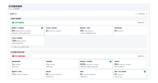 クロスログに登録されている訪問予定や患者情報をもとに、クロスログ レポート上で必要な情報を自動集計。新設された「在宅医療充実体制加算」や、要件が見直された「在医総管・施設総管」の施設基準を瞬時に判定します。