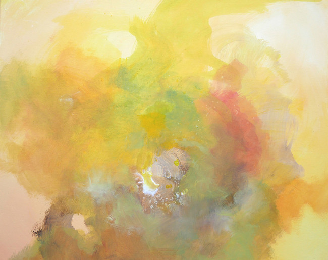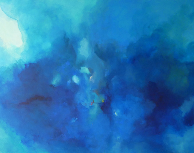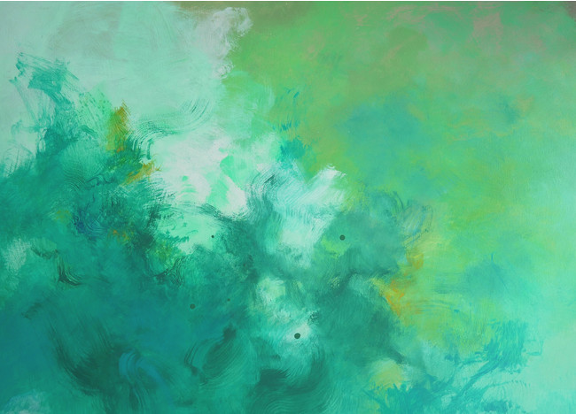 キャンバスに下塗りをし、その上にアクリル絵具で幾重にも色を重ねた作品群。色の奥の奥に潜む色は、この世界のあらゆる事象には簡単に片付けられない複雑さがあることを意味し、色と色の交じり合いは生きとし生けるものが交じり合う世界の奇跡を表現しています。