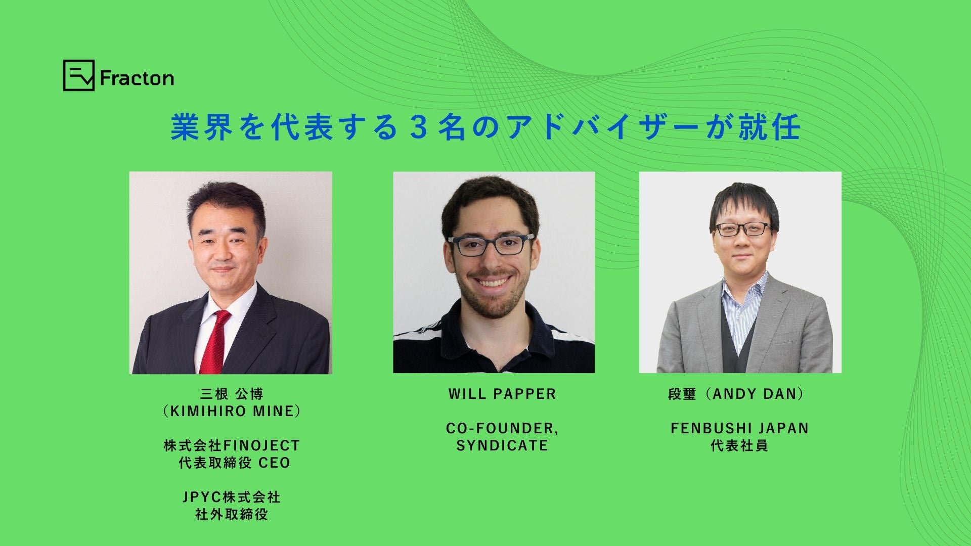 2026年3月12日、東京 - Ethereumを基盤としたインキュベーションおよび企業向けデジタルアセット戦略を展開するFracton Ventures株式会社(本社:東京都品川区、代表取締役:鈴木 雄大、亀井 聡彦)は、本日、クリプトおよびデジタルアセット領域を代表する3名がアドバイザーに就任したことを発表しました。