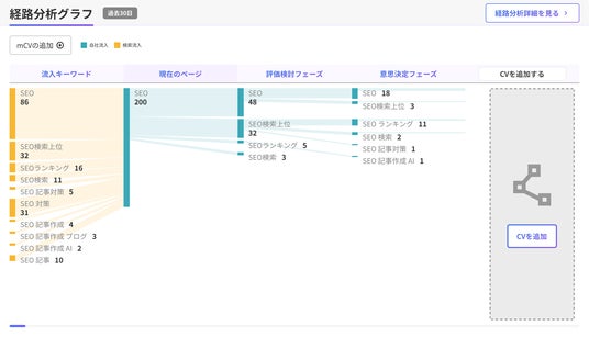 コンバージョンに至るユーザーの経路を「情報収集フェーズ」「評価検討フェーズ」「意思決定フェーズ」の3段階で可視化し、各記事やページのフェーズ別貢献度を明らかにする機能です。これにより、単一記事ごとの評価だけでなく、「どのコンテンツが購買ファネルのどこで機能しているのか」を把握できます。複数のCV地点に対する貢献の比較も可能で、経路全体を俯瞰した最適化が実現します。