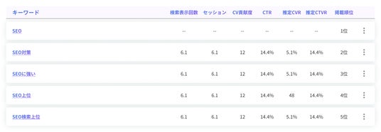 ユーザーがどのキーワードを通じて流入し、その後どれだけコンバージョンにつながったかを推定できる機能です。検索表示回数、セッション数、CTR(クリック率)、CVR(コンバージョン率)などをもとに、各キーワードの推定CVを算出します。これにより、流入を生むだけのキーワードではなく、「実際に成果に貢献するキーワード」の選定と戦略的活用が可能になります。