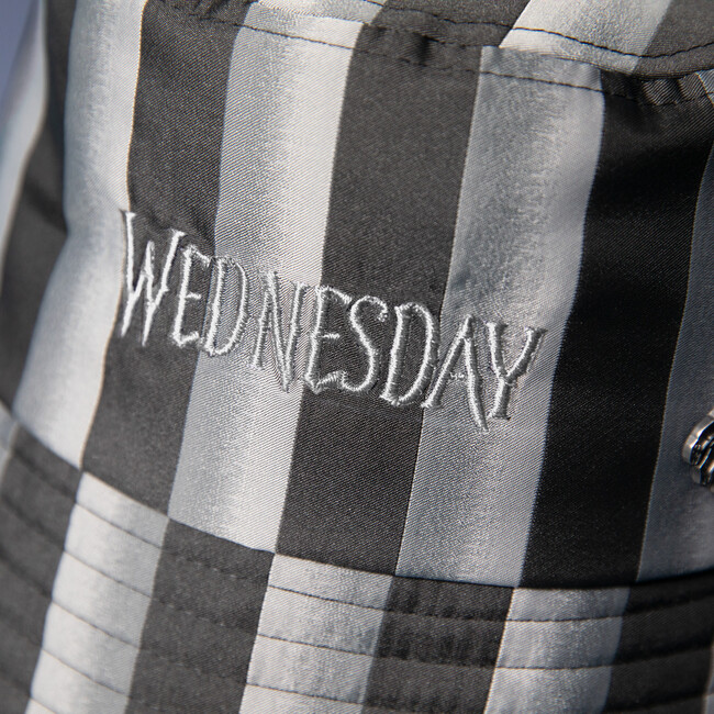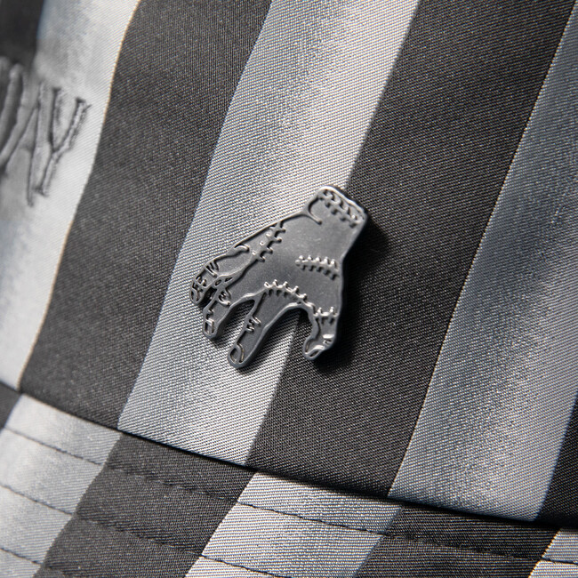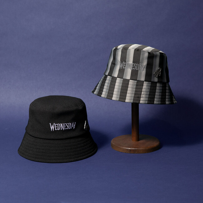 作品ロゴを3D刺繡で立体的に表現したバケットハット。ロゴのインパクトが映えるシンプルなブラックと、作中で登場するウェンズデーの通うネヴァーモア学園の制服をイメージしたストライプ柄の2色をご用意しています。