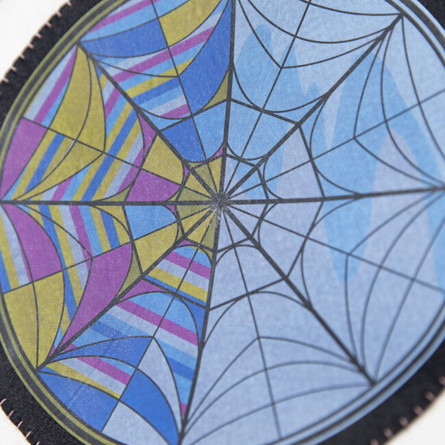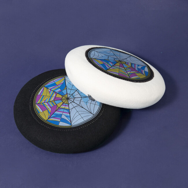 ウェンズデーとイーニッドが暮らすオフィーリア寮の部屋にある、巨大なステンドグラス窓をモチーフにしたベレー。象徴的な蜘蛛の巣柄をプリントで大胆に表現した、バックスタイルが目を惹くデザインです。