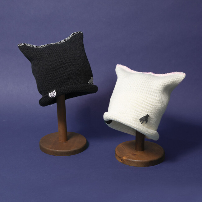 ネヴァーモア学園の伝統行事「ポー・カップ」の黒猫チームをモチーフにした、猫耳ニットキャップ。ウェンズデーとルームメイトのイーニッドをイメージしたカラーリングのニットキャップに、チームのシンボルマークやユニフォームのステッチなど、こだわりのディテールを落とし込んでいます。