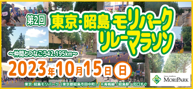 2023年10月15日(日)JR青梅線昭島駅北口にある都市型リゾートエリア 東京・昭島 モリパーク(運営:昭和飛行機都市開発株式会社)にて、タスキをつないで42.195kmを走行する『第2回 東京・昭島 モリパークリレーマラソン』を開催します。