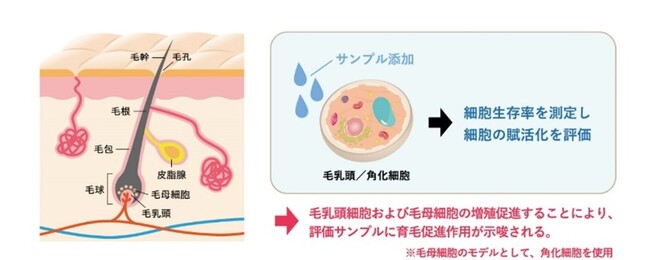 毛髪の成長には毛乳頭細胞と角化細胞が関わっています。毛乳頭細胞が毛母細胞に増殖するよう指令を出し、毛母細胞が増殖することで毛髪が作られていきます。毛髪が成長するにはこれらの細胞が活性化され、増殖することが不可欠です。今回、オリジナル香料がこれらの細胞を増殖させる効果があるか試験を行いました。