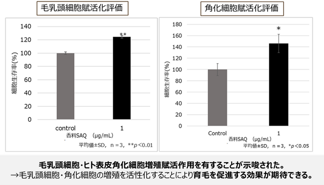 試験の結果、オリジナル香料には角化細胞、毛乳頭細胞ともに増殖させる効果が見られたことから、育毛促進作用が期待されます。