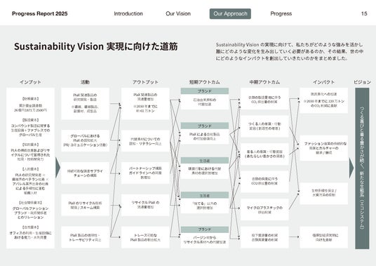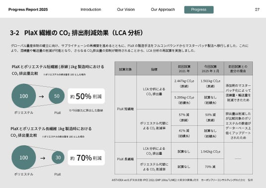 本レポートでは、PlaXの新たなグローバルサプライチェーンでのLCA分析の結果や、サステナビリティビジョン実現に向けてのロジックモデルと活動、ケミカルリサイクルの実証実験の進捗について初公開しています。
