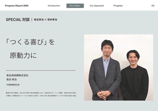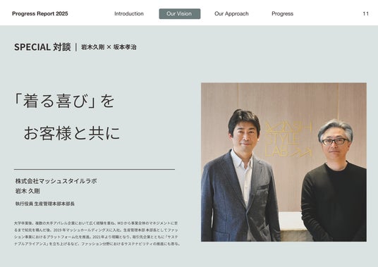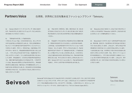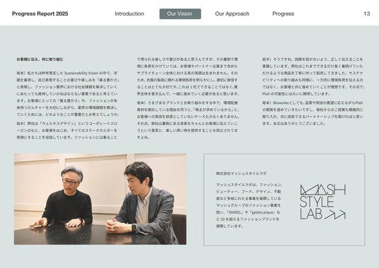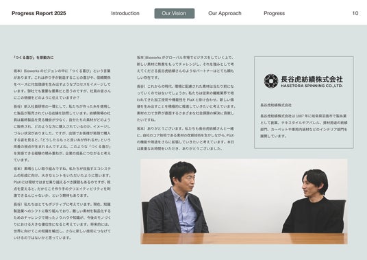 本レポートでは、Bioworksがサステナビリティビジョンに掲げる「つくる喜び」と「着る豊かさ」をテーマに、ステークホルダーと対談したインタビュー記事を公開しています。