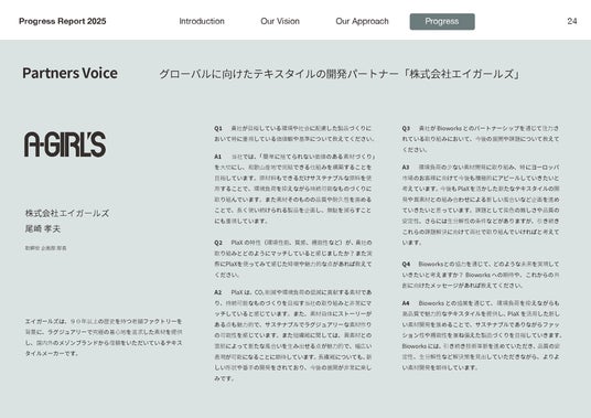 Bioworks株式会社(本社:京都府相楽郡、代表取締役社長CEO:坂本孝治、以下「Bioworks」)は、サステナビリティビジョン実現に向けた取り組みや、自社が研究開発する植物由来の次世代合成繊維「PlaX(プラックス)」の事業・開発進捗とパートナー企業との連携についてまとめた「Progress Report 2025」を発行しました。