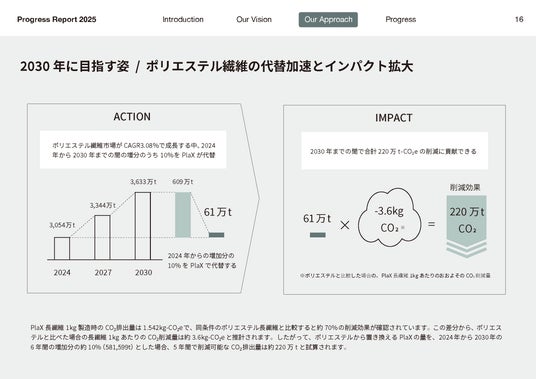 また本レポートでは、Bioworksが2030年までに目指す姿として、石油由来のポリエステルの2024年から2030年までの増分のうち10%を代替し、合計220万t-CO2の削減に貢献することを掲げています。