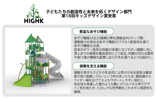 株式会社ジャクエツ(本社:福井県敦賀市/社長:徳本達郎)の大型遊具、HIGHK(ハイク)が特定非営利活動法人キッズデザイン協議会主催(後援:経済産業省・内閣府・消費者庁・こども家庭庁)の「第18回キッズデザイン賞」を受賞しました。