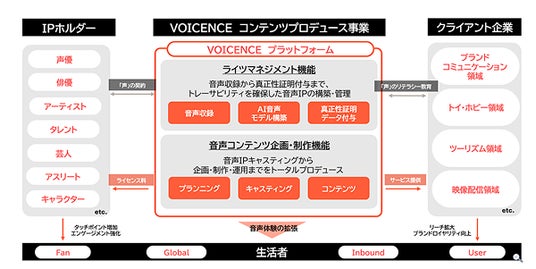 音声AI事業 「VOICENCE」は、AI音声合成と独自の権利保護技術を組み合わせたプラットフォームを構築することにより、声優・俳優・タレントなどの実演家から提供された「声」を「公認AI」として、安全かつ健全な活用を促進するコンテンツプロデュース事業です。