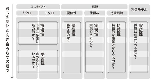 専門性の異なるメンバーや、決裁権を持つ経営層との間では、事業を評価する観点や、ビジネスモデルに対する認識のズレが障壁となりがちです。VDSは、事業見極めに必要な論点を6つに定めた上で、ビジネスの全体像を誰もが理解できる「構文」で可視化するため、認識の齟齬を防ぎます。