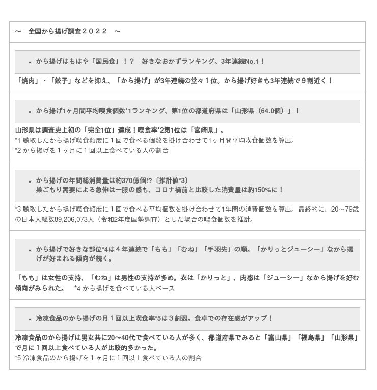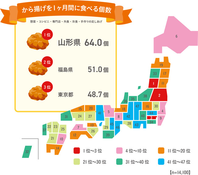 から揚げ1ヶ月間平均喫食個数*1ランキング、第1位の都道府県は「山形県(64.0個)」!
