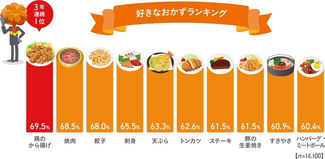 調査回答者に、全29品のおかずから好きなものを選択(複数選択可)してもらったところ、全体の69.5%が「から揚げ」を選択。3年連続で好きなおかずランキング第1位に輝いた。2位には「焼肉(68.5%)」、3位には「餃子(68.0%)」がランクイン。