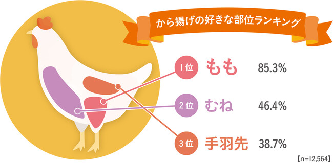 から揚げの好きな部位をみると、4年連続で「もも(85.3%)」「むね(46.4%)」「手羽先(37.8%)」の順。