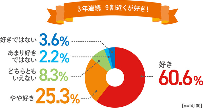から揚げの好意レベルを聞いたところ、3年連続で9割近くが好きと回答(「好き(60.6%)」、「やや好き(25.3%)」)。