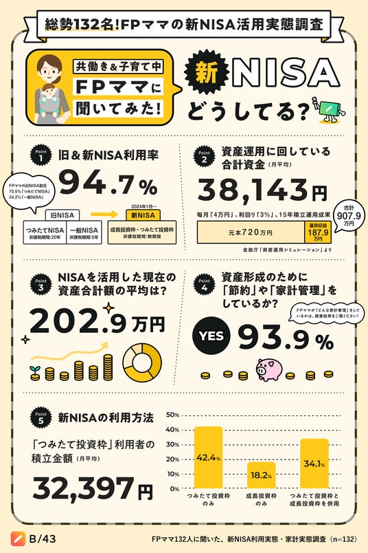 共働きで子育てもしている「FPママ」132人に新NISAの活用状況を尋ねたところ、94.7%が新NISAを活用していると回答しました。具体的なNISAの活用実態を尋ねたところ、NISAを活用した資産の合計額は平均で202.9万円、毎月資産運用に回している資金は平均で38,143円、NISA「つみたて投資枠」利用者の積立金額は月平均で32,397円となりました。