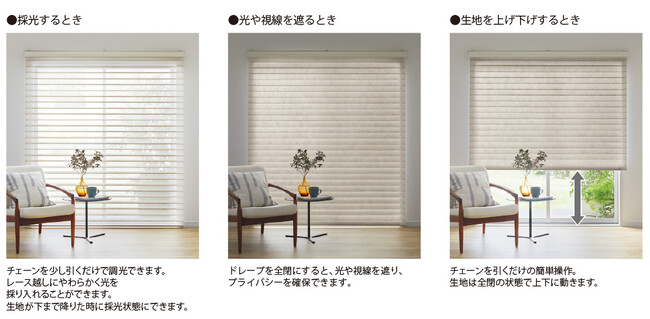 「ルミエ」は、大きな窓でも軽い力で操作できる手動の「チェーン操作」と、リモコンやスイッチで簡単&スマートに操作できる電動の「スマートインテリアシェード ホームタコス」に対応しているため、シーンやライフスタイルに合わせてピッタリの操作方法をお選びいただけます。