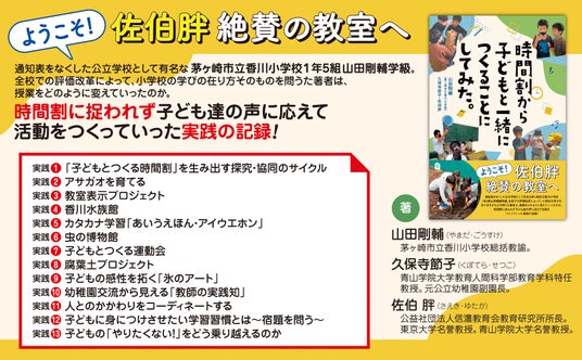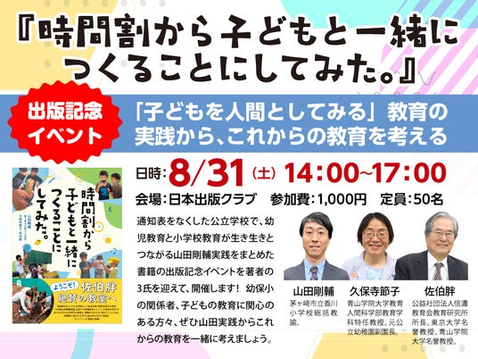 学事出版株式会社(代表取締役社長 鈴木宣昭)は、通知表をなくした公立学校として有名な茅ヶ崎市立香川小学校の山田剛輔氏の実践をまとめた『時間割から子どもと一緒につくることにしてみた。』を刊行いたします。それに合わせて、著者の山田剛輔氏、青山学院大学教育人間科学部教育学科特任教授の久保寺節子氏、さらに東京大学名誉教授の佐伯胖氏を迎えて、50名限定のスペシャルトークイベントを2024年8月31日(土)に開催いたします。なお、当日は会場限定でどこよりも早く、本書の即売会も実施いたします。