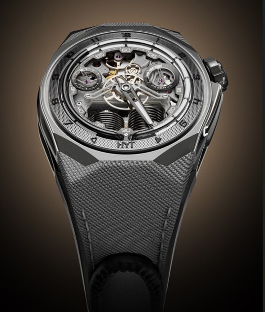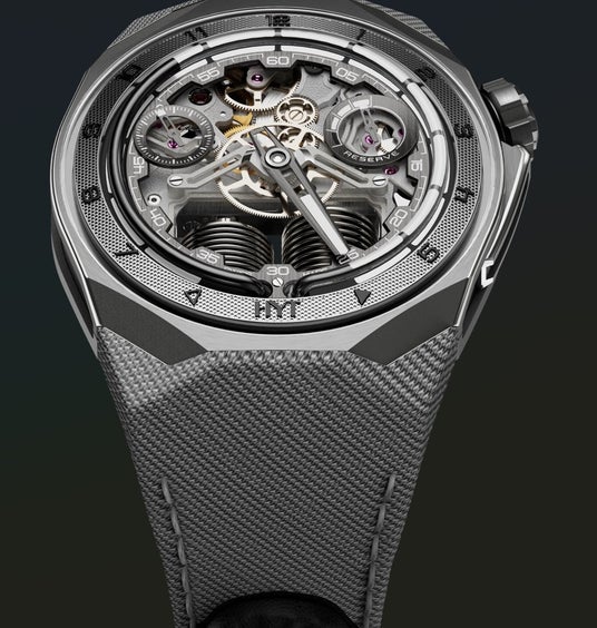 2 つの小さなベローと、精巧なサンドブラスト仕上げとサテン仕上げのムーブメント部品を備えたこのムーブメントのユニークな外観は、2012 年に初めてハイドロメカニカルな HYT の作品が時計界に登場してから 12 年経った今でも、劇的なものと捉えられるでしょう。しかし、今回のキャリバー501-CMの性能はブランドの自信につながっています。長年の開発と微調整により、他に類を見ない信頼性の高いムーブメントが誕生したのです。