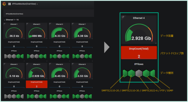 拠点間を流れるIPフローの通信状況をリアルタイムに監視・可視化する製品です。放送の IP 化において標準規格となっている SMPTE ST2110、ST2022 をはじめとした主要なデータ種別に対応しており、障害時の原因把握やリアルタイムでのデータ分析・可視化を実現することで、IP 化された放送システムの運用コストの大幅な削減に貢献します。