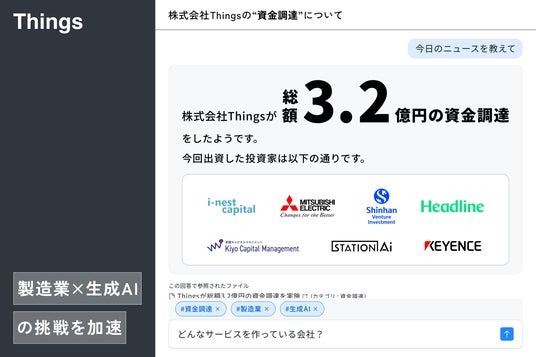 Thingsはこの環境変化を大きな機会と捉え、プロダクト開発の加速と事業拡大に耐えうる強固な組織体制の構築を目的に資金調達を実施。エンジニアに加え、セールスやカスタマーサクセス(CS)を含む組織全体の基盤を強化し、生成AIを活用した技術情報の掘り起こしと活用をより多くの現場で支援してまいります。