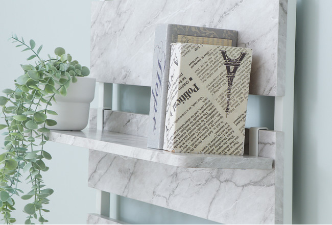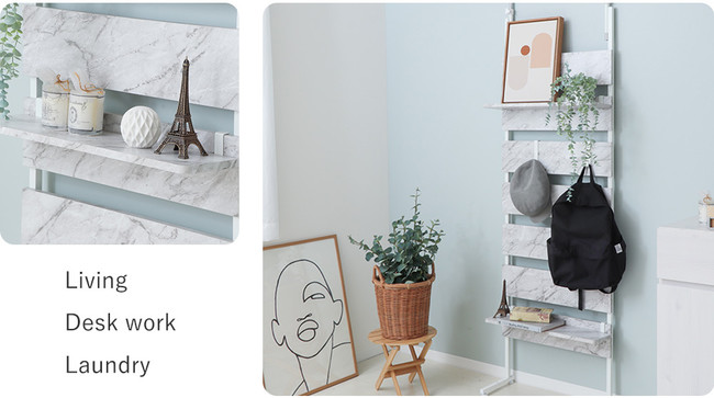 清潔感のある白いフレームに高級感のある大理石柄と温かみのある木目柄の棚板を組み合わせた2つのバリエーションをご用意いたしました。
