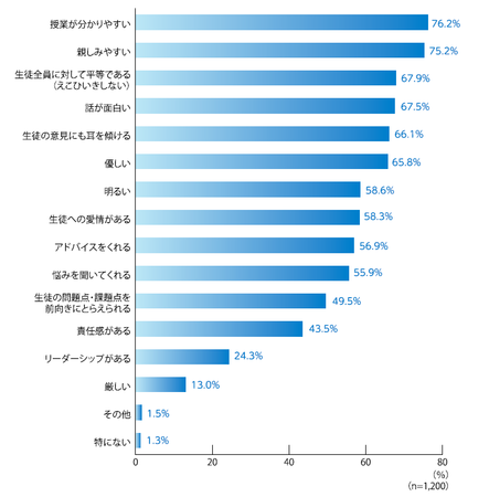 今回、全国の中学・高校生1,200人を対象に、学校の先生に必要だと思うことを調べたところ、「授業が分かりやすい」(76.2%)、「親しみやすい」(75.2%)、「生徒全員に対して平等である(えこひいきしない)」(67.9%)、「話が面白い」(67.5%)、「生徒の意見にも耳を傾ける」(66.1%)、「優しい」(65.8%)などの生徒の学力を伸ばすスキル以外に、生徒の心理的な安心安全や学習環境をつくるスキルが多くあがりました。
